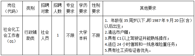 因工作需要,現(xiàn)清城區(qū)總工會面向社會公開招聘1名社會化工會工作者(屬非編制人員,不列入用人單位編制序列,不擔(dān)任行政職務(wù)),現(xiàn)將有關(guān)事項(xiàng)公告如下: